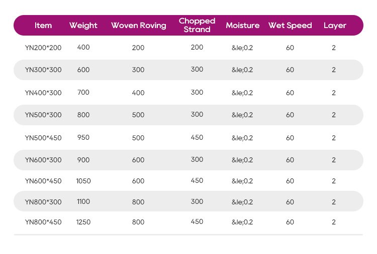Recommended Specifications: 600gsm Woven Roving+300gsm Mat/600gsm Woven Roving+450gsm Mat、1250mm Width